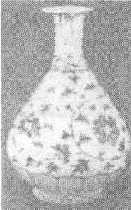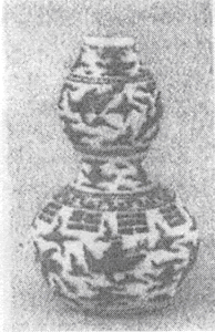 明初洪武的青花瓷,造型粗重厚实,制作尚未脱尽元青花的粗犷风格。所见的大都是蓝中见黑的色泽。多为碗类,还有少量大盘、菱日盏托、梅瓶、执壶、大罐等。但传世较少。传世品中,还有一种梅瓶,外绘云龙纹,肩部有“春寿”两字,这种梅瓶,传世仅见三件,一件藏于上海博物馆,一件藏于私人手中,另一件藏于日木大阪东洋陶瓷美术馆,这三件作品制作十分精美是洪武青花中的上品。