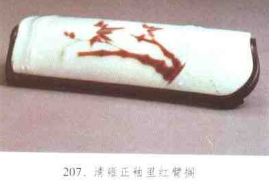 文房用品,用于写字时搁放手臂、形状多为半圆筒形,似半剖的竹筒。宋代官窑制品中有天青釉器,搁面微凸,剖面四角有垫烧痕,中间为细小的两组支钉痕。清代前期,景德镇御窑厂烧制粉彩及仿各种质地的象生制品。(见图207)
