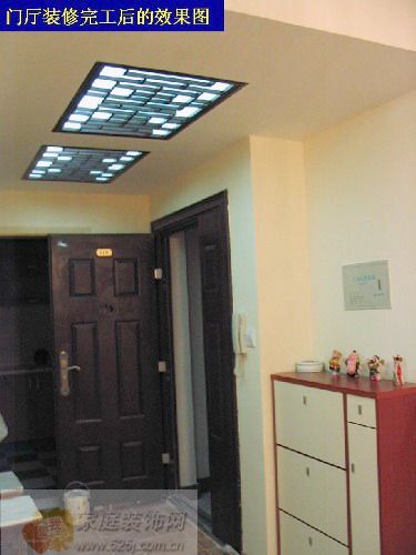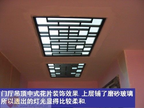 门厅吊顶不是例常单一的灯具,而是镶嵌在吊顶里面的中式花片式的吊灯,而磨砂的玻璃,更让这款吊灯显得有古代窗棂的感觉,而本身的造型,就有点像古房中的天窗,只是这个天窗非常具有中式的风格。