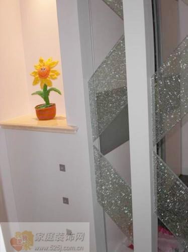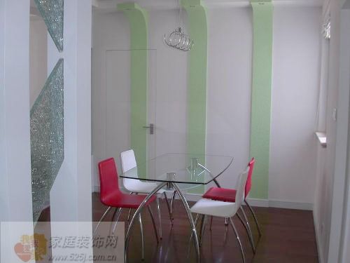 入门口处储藏室墙壁的加长,直接制造出了一块玄关的资源,既可以当作鞋箱使用,又可以营造出别样的空间,裂纹玻璃的使用,正好和客厅内的玻璃柱子形成呼应。在餐厅的墙面设计上面,同样也是方柱形状的墙面造型,这样,玄关支撑玻璃的方柱、餐厅的墙面凸柱,还有客厅的玻璃方柱,都成为一个在不同空间内有机联系的主体。