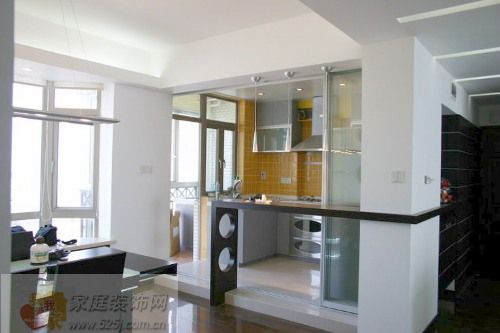 此处房产的北阳台条件相当好,通风,半落地的大窗,为设计师造景准备了条件。对于餐厅和厨房的处理是打通与厨房的墙壁,做一个吧台,隔开两个空间,同时预留走道,将原先在外面走道的厨房门移到餐厅中来。厨房变为半开放式,使餐厅和厨房成为一个有机的组成部分。也在视觉上,扩展了视野,同时厨房又借用了北阳台大窗的自然光照明。