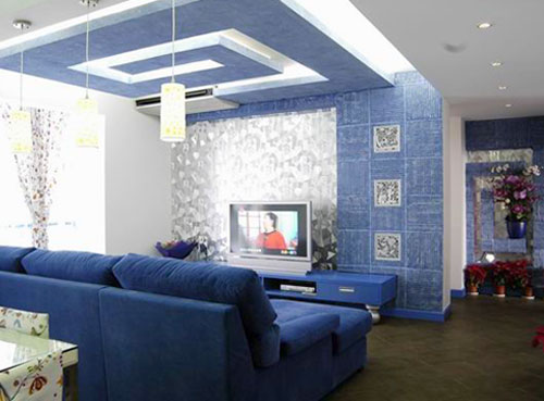 客厅体现了现代中式的复古情怀。整体以蓝色与白色为主打色,这使空间感觉既清爽又有多了份淳朴感。电视背景墙设计采用银色的墙纸,这不仅使客厅空间显得很明亮而且还很漂亮,突出了客厅的个性与时尚感。客厅里采用回纹式的吊顶,这是很少见的现代中式风格的一种设计表现法(据说采用回纹设计是女业主在逛街的时候偶尔看见的觉得这种图案很特别,接着在后来很多地方都设计回纹),这既是现代中式风格标志又与众不同很有感觉。客厅采用了深色的地砖这与客厅淡雅的色彩形成鲜明的对比,深色的地砖还避免了由于吊顶而产生头重脚轻的感觉,使空间多了份浓郁的书香气息。