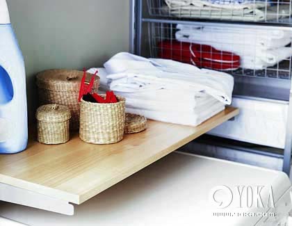 可以自由升降、调节高度的托架和搁板是洗衣区必备的收纳法宝。搁板下放洗衣机,搁板上则可以摆放一些阳台晾晒小工具。