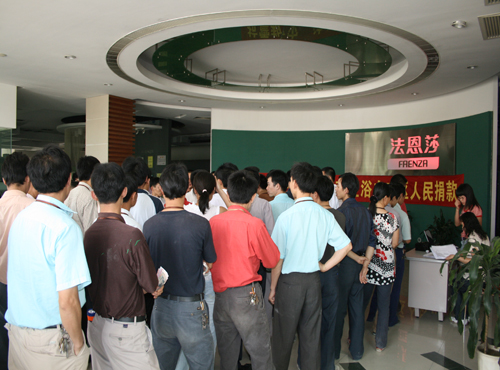15日下午2时,法恩莎员工齐聚在法恩莎大厅举行了抗震救灾捐款活动,大家排起长龙,纷纷慷慨解囊,一百、两百、三百……投入了募捐箱,现场涌动着一片融融真情,感染着在场的每一位在场人员。一位来办事的男士看到大家争相捐助,当即掏出一百元参加募捐活动,他激动说道:“灾难无情人有情,看到灾区人民正经受着这么大的灾难,我也要为灾区人民献出自己的一份爱心。”