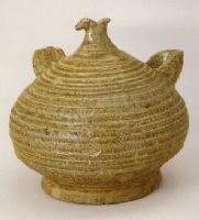 说 明: 原始瓷器。鹰头形小口,斜长颈,溜肩。通体饰密集弦纹。