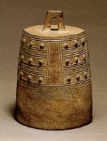 说 明: 仿青铜钟形制,器表施有一层晶亮的黄色薄釉。制造精巧,仿造逼真。