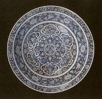 说 明: 扳沿口,弧腹,矮圈足。内外绘青花纹饰。花纹曾曾叠叠,满布而有层次。