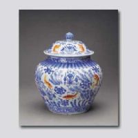 池塘游鱼纹在嘉靖时期较为流行,寓意"金玉满堂"。罐体以青花满绘长满了莲花和水藻的池塘,其间绘十二尾戏水追逐的游鱼。鱼身以黄彩为地,以红彩勾画轮廓及鱼鳞,以黑彩点睛,红鱼与青花相映成趣。底书青花"大明嘉靖年制"楷书款。