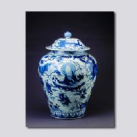 首都博物馆藏。直口,短颈,丰肩,收腹,砂底,宝珠形钮盖。盖上绘龙穿花。腹部主题纹饰为群仙祝寿图:画面中心绘一巨大的寿星坐于山石之上,周围绘有鹤、鹿、石及人物22个。外底书青花双圈“大明嘉靖年制”楷书款。
