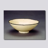 首都博物馆藏。六瓣花形口,芒口镶铜扣,弧腹,浅圈足。碗内满印花纹,口沿印回纹一周,内壁印三只芦雁穿行于石榴花丛中。器底作缠枝瓜果图案。胎质洁白细腻,胎体轻薄,内外均施白釉。釉色白中泛黄。