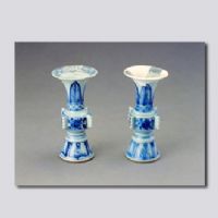首都博物馆藏。仿商周青铜觚造型,撇口,长颈,折肩,小腹,腹四边出戟,平沙底,矩形孔,内为深挖足。内壁口沿绘卷草纹,外壁颈部饰蕉叶纹,腹部两戟间绘折枝菊纹,足部为覆莲瓣纹。青花色泽浓艳,白胎砂底,无釉处见火石红色,釉色光润,白中闪青。为景德镇窑制品。瓷觚始见于宋,元、明、清各朝均有烧制。