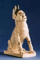此兽人面兽身,昂首挺胸,项背附戟,面部狰狞,肩部有刻划的花翼。通体施白釉,唯面部间绘黑彩。