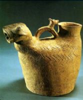 胎色灰白,釉色淡黄,且薄而均匀。以虎首为流,一兽作提梁。口、腹和底均呈椭圆形。背面和上腹刻划方折纹,腹下部刻划竖线纹和方格纹。整器犹如一只张口、翘尾的猛虎,造型颇为别致。