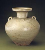 壶盘口,束颈,丰肩,敛腹,平底。通体施青釉。外口凸起弦纹,肩部堆贴兽面衔环装饰,两侧各立双系。肩部模印网纹,网纹上下各戳印小菊花纹一周。