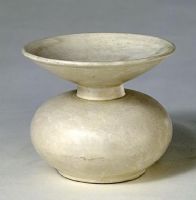 奓斗口外撇,口沿呈漏斗形碗状,扁圆腹,平底。器里外施白釉,底无釉。此件奓斗胎质洁白细腻,釉色莹润雪白,造型规整大方,在唐代白瓷中属上乘之作。