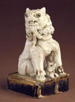 狮子昂首,两眼凸起,双耳直立,张口露齿,长须卷发,前腿直,后腿曲,尾上卷,伏卧于台上。狮的眼睛及腿部均点以褐彩。台为长方形,上下垂直,四周施褐色釉,深处呈黑色。唐代,由于经济文化的发达,制瓷业也有了很大的发展,瓷器品种与造型新颖多样。此件白釉狮子姿态雄健,浑厚古朴,为唐代瓷塑艺术的一件杰作。