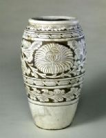 缸唇口,溜肩,深腹,圈足。外壁通体以剔花装饰。其做法是先在灰褐色胎上施一层洁白的化妆土,划出花叶、缠枝牡丹、回纹等纹样,再将花纹以外的地子上的白色化妆土剔掉,露出灰褐色胎,形成深色地子衬托白色花纹的装饰效果。