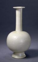 瓶平口外折,颈细长,圆腹,高圈足外撇。腹部刻螭龙穿花纹饰。此瓶造型优美,胎体洁白,螭龙纹刻划得矫健生动,刀工遒劲有力,线条自然清晰,为定窑的上乘佳作。