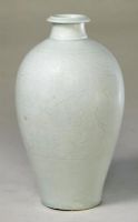 瓶小口出边,溜肩,肩下渐收,内圈足。通体施青白釉,腹部刻缠枝花卉。此梅瓶造型比宋代较为典型的修长形梅瓶略显粗短。所刻花纹在匀净的青白釉面上若隐若现,青白相映,素雅恬静。景德镇窑青白釉瓷器胎质洁白,声音清脆,因此有专家认为传说中对“柴窑”的品评,所谓“青如天,明如镜,薄如纸,声如磬”,很可能是指这种青白釉而言。