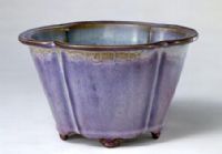 此花盆托胎体厚重坚硬,造型美观实用,是典型的宫廷用器。其釉面莹润匀净,月白色幽柔典雅,玫瑰紫色绚美艳丽,此精美的花盆托是典型的宫廷用器。