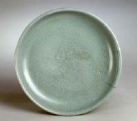 盘口微撇,圈足外撇。盘身满釉,开细碎纹片。底有5个支烧钉痕,并刻有“寿成殿皇后阁”六字。
