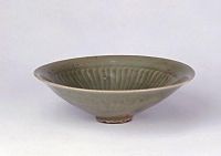 碗敞口,深弧壁,圈足。内外施青黄釉。碗心模印菊花一朵,内、外壁分别采用剔刻放射性线条的方式表现菊瓣图案。