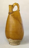 壶式较高,上扁下圆。壶上端一侧出管状口,口与肩上另一侧连以鸡冠状提梁,管与提梁根部饰凸起的带状饰物。壶下部饱满,圈足微外撇。釉下施白色化妆土,黄釉施至近足部。釉色光亮,釉面开有细小的纹片。