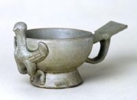 鸟式杯仿汉代铜器式样,敞口微敛,弧壁渐收,高圈足外撇。杯外壁贴塑一飞鸟,头部高出杯口,伸展双翅,相对处饰鸟尾为柄。内外均施青釉,釉色青绿微闪黄色,釉面有细小的开片纹。鸟身刻划线纹、圆点纹,鸟尾划直线纹。