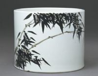 清康熙朝官窑瓷器的装饰画面有许多出自当时名画师的手笔。此笔筒所绘的簇簇墨竹清秀挺拔,瘦劲有力,深浅相宜,富于层次感,有如画在白纸上的国画一般生动细腻,绝非一般工匠所能为。加之墨彩黑亮如漆,光滑浓艳,与纯白的底釉构成强烈的色彩对比,赋予此笔筒不同凡俗的审美意趣。此墨彩笔筒将诗、书、画、印结合于一体,为康熙朝五彩瓷文具中的精品。