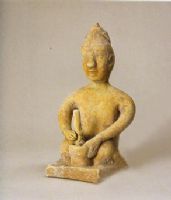 俑作跪姿。头戴□帽,后沿向上翻,身着圆领窄袖衣,浓眉,大鼻,双目圆睁,双眉之间有一颗白毫相,嘴微张。整个俑跪在瓷板上,板前置一碓钵,右手执杵,左手扶钵做舂物状。此种俑多见于三国时期的吴国和两晋时期墓葬中。