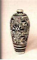 瓶小口、短颈、溜肩、腹瘦长、宽圈足、俗称梅瓶。瓶身白地黑花,肩部为单线连瓣纹,下为弦纹。腹部绘缠枝花卉,自然豪放,花瓣肥硕,花叶细长,以图案式满佈腹部,花、叶主次分明。下部为一组组弦纹装饰。此器为宋磁州窑梅瓶的典型作品,色调黑白对比强烈,体出了磁州窑白地黑花装饰的主要特色。
