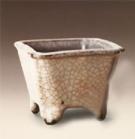 盆为四方形,委角,折沿,侈口,四垂云纹足,裹外施青釉,釉面开赭色纹片,裹心有五个支钉痕。宋代花盆的生产是为了满足宫廷陈设的需要,其造型多样,规格齐全。