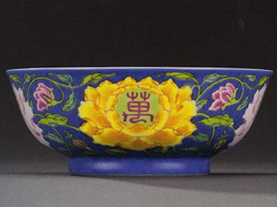 (雍正御制珐琅彩蓝地缠枝牡丹纹“万寿长春”碗 )