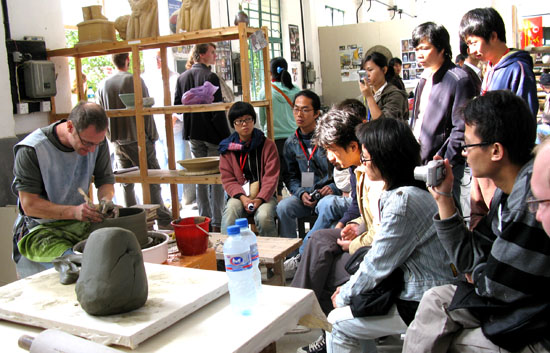 作为“共同的旅程——中美陶瓷艺术教育国际研讨会”的活动之一,大师们的现场表演不仅给大家带来了一场视觉上的盛宴,还让大家对艺术产生了新的认识,让大家从艺术的角度去思考人生,看待问题。我校学生在接受江西省教育电视台采访时说:“非常感谢学校能给我们提供这样一个贴近大师学习的机会,看了老师的作品后,感觉自己的作品比较粗糙、缺乏想象力和创造力,以后会经常像老师学习,培养创新思维,认真思考艺术的真正内涵”。
