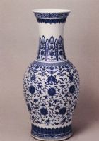 尊撇口,长颈,弧腹,圈足微外撇。青花纹饰,口沿饰忍冬纹和如意云头纹,颈饰蕉叶,纹内饰朵莲,肩饰回纹及团花,腹饰缠枝莲及八宝,近足处饰变形莲瓣,忍冬纹。