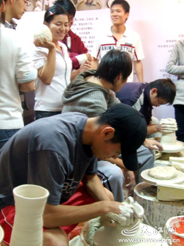 9日,由景德镇陶瓷学院美术学班的五名学生自办的景德镇非物质文化遗产——制瓷手艺展拉坯比赛在该市御窑厂如期举行。这一由大学生自己主办的活动,吸引了众多学生和市民关注。