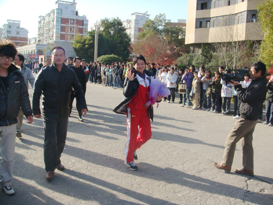 景德镇在线讯:12月5日下午,北京奥运会女子49公斤级跆拳道冠军吴静钰和家人、教练,景德镇市体育局领导一行来陶瓷学院参观,受到了学校党委书记肖任贤等校领导和数百名师生的热烈欢迎。学生代表向吴静钰敬献了鲜花,并一致表示“向奥运冠军致敬,向奥运冠军学习”。