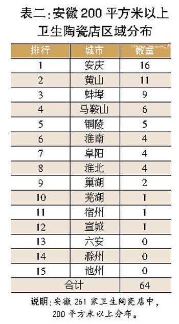 在安徽地级市场中,恒洁、惠达、吉事达、英皇、申鹭达等卫生洁具品牌都有网络,虽然网点不多,但品牌影响力在这些地级市场中仍不可小视。在调查的261家卫生陶瓷店中,100-200平方米经营面积数量占比近50%(详见表一),成为地级陶瓷店的主流,马鞍山、安庆、蚌埠、黄山等地的卫生陶瓷店面积普遍较大,其中,就200平方米以上经营面积看(详见表二),安庆仍居首位,黄山尾随其后。而滁州、池州的卫生陶瓷店与建陶店一样,仍多以较小面积为主。