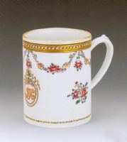 杯子呈直桶形,有环形手柄,以釉上彩和金彩绘以欧洲风格图案,围绕开光内有字母IH。