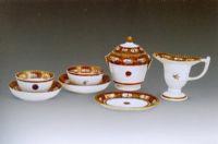 这是一套饮茶用具,器物装饰手法为釉上彩加金,在每件器物的口沿处均装饰有酱色描金的宽边织锦地,锦地有大小不同的开光花鸟较长案。其中一件上还有隐藏的字母JT。