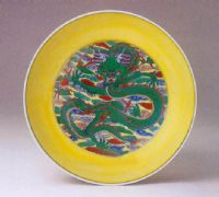 盘敞口,弧壁,圈足。里外均为黄地斗彩纹饰,盘心绘正面龙一条衬以火珠云纹,外壁主题纹饰为云龙,云凤赶珠纹,近足处绘海水江崖,底书青花双圈“大清康熙年制”六字双行楷书款。