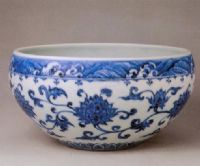 钵敛口,弧腹下敛,平底。通体青花纹饰,里心饰折枝桃纹,外口沿饰海水纹,腹饰缠枝莲纹,近底处饰双层莲瓣纹。