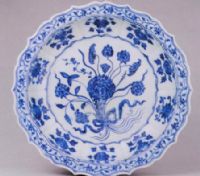 盘菱花口。青花纹饰,盘心饰束莲纹,里外壁均饰折枝花纹,折沿饰缠枝花卉纹。外口沿下青花横书“大明宣德年制”六字楷书款。此盘里心纹饰又称“把莲纹”,是宣德瓷器上独具特色的装饰。此器是宣德时典型器。