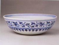 碗撇口,浅腹,卧足。青花纹饰,里心和里壁饰变形桃纹,两者间饰缠枝花叶纹,口沿饰青花线,外壁饰缠枝花纹,下饰变形如意云头纹。
