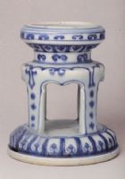 器圆口内收,束腰中空,下承以四如意形足,衔接覆盘式底,青花纹饰分别为朵花,方点,圆点,仰莲瓣纹,底青花双圈内书“大明正德年制”六字楷书款。此器造型奇特,为净水碗之托用于佛前供奉。
