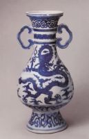 瓶盘口,束颈,垂腹,高圈足外撇,颈两侧分饰如意云耳,青花主体纹饰绘云龙纹,辅以如意云头,卷云,仰莲瓣,变形忍冬纹等边饰,底青花双圈内书“大明嘉靖年制”六字楷书款。