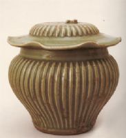 直口,溜肩,鼓腹。荷叶式盖。全器买饰纵向条纹。胎质坚致,青绿釉均匀明润。是典型的[龙泉窑]上乘作品