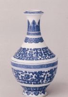 瓶敛口,长颈,折肩,收腹,圈足外撇。主体青花绘夔凤纹,辅以蕉叶、回纹、如意云头、变形莲瓣纹等边饰。