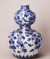 瓶呈葫芦形,直口,双圆腹,束腰,圈足。青花纹饰,通体满绘缠枝葫芦,飞翔的蝙蝠穿插其中,口沿与近足处饰回纹与蕉叶。