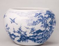 缸敛口,圆腹,卧足。器身通景青花绘《鹤鹿图》,图中山峦坡地连绵逶迤,松、竹、梅挺拔茂盛,草木葱郁;空中有祥云飞鹤,林中有梅花鹿先后相随。